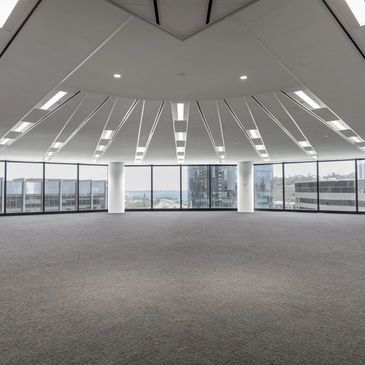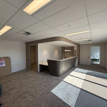 Complete office transformation featuring new gypsum partition walls, suspended drop ceilings with recessed lighting, and sleek satin silver aluminium skirting throughout. Creating a calm, safe and professional environment.