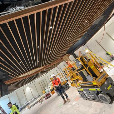 Warm, open-grid solid Australian hardwood feature ceiling – natural finish, fully fire-rated, seamlessly integrated with services. Bringing timeless elegance and superior acoustics to the heart of T1.