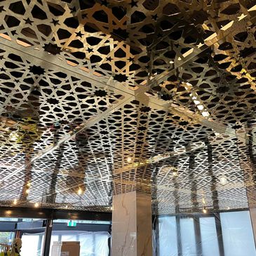 The installation involves a 1450mm unidirectional grid ceiling, which incorporates complex radial craftsmanship at three corners of the building.